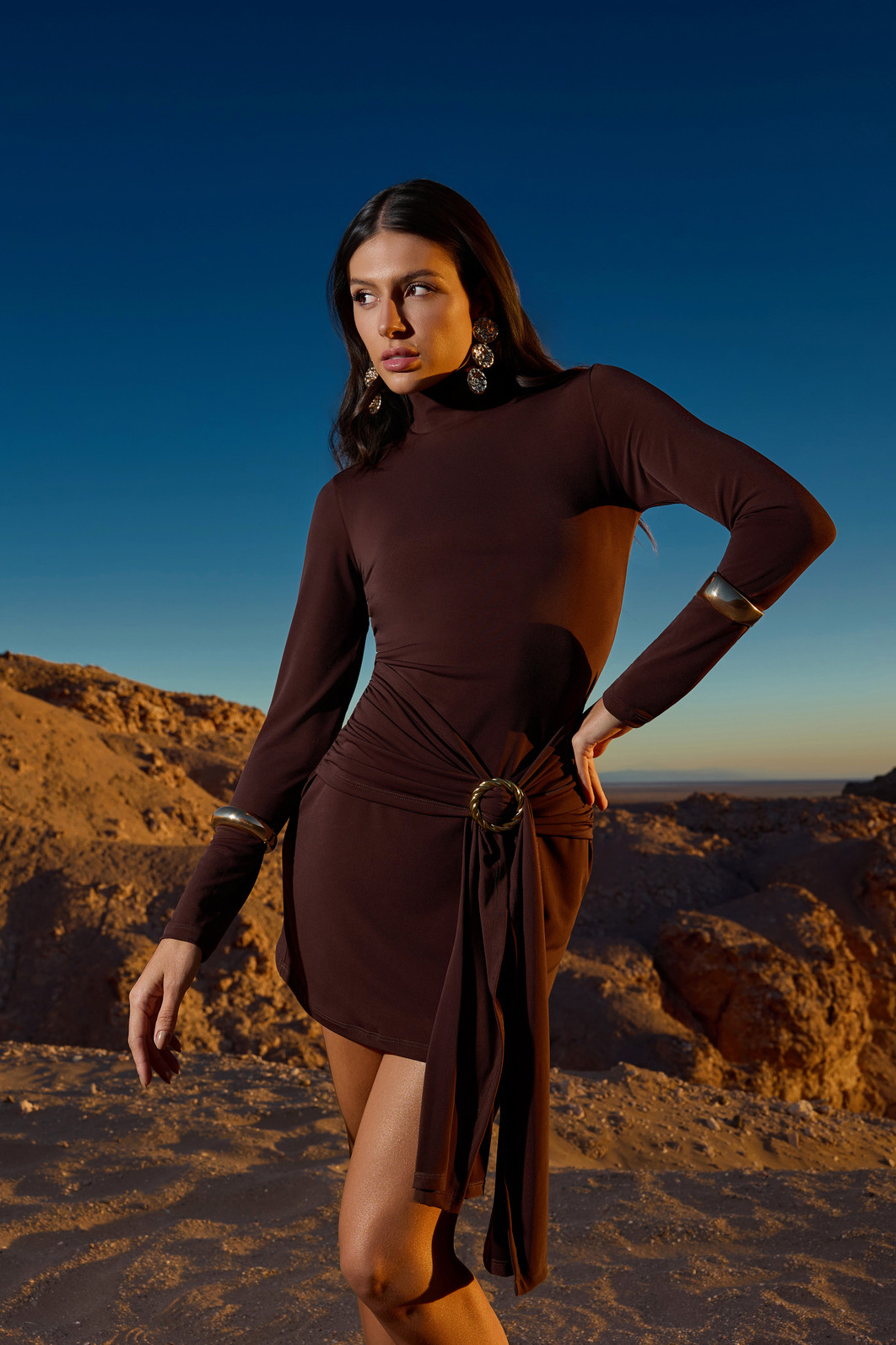 AdicionarVestido curto manga longa em malha jersey. Possui gola alta e detalhe de sobreposição com faixas laterais e fivela dourada. A peça veste mais ajustada ao corpo. Composição: 96% Poliéster, 04% Elastano. MEDIDAS DA MODELO: *MODELO VESTINDO TAMANHO P/36 NA FOTO*.