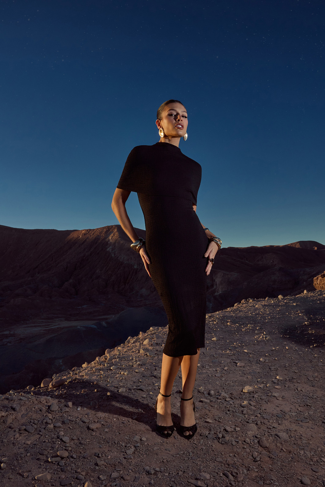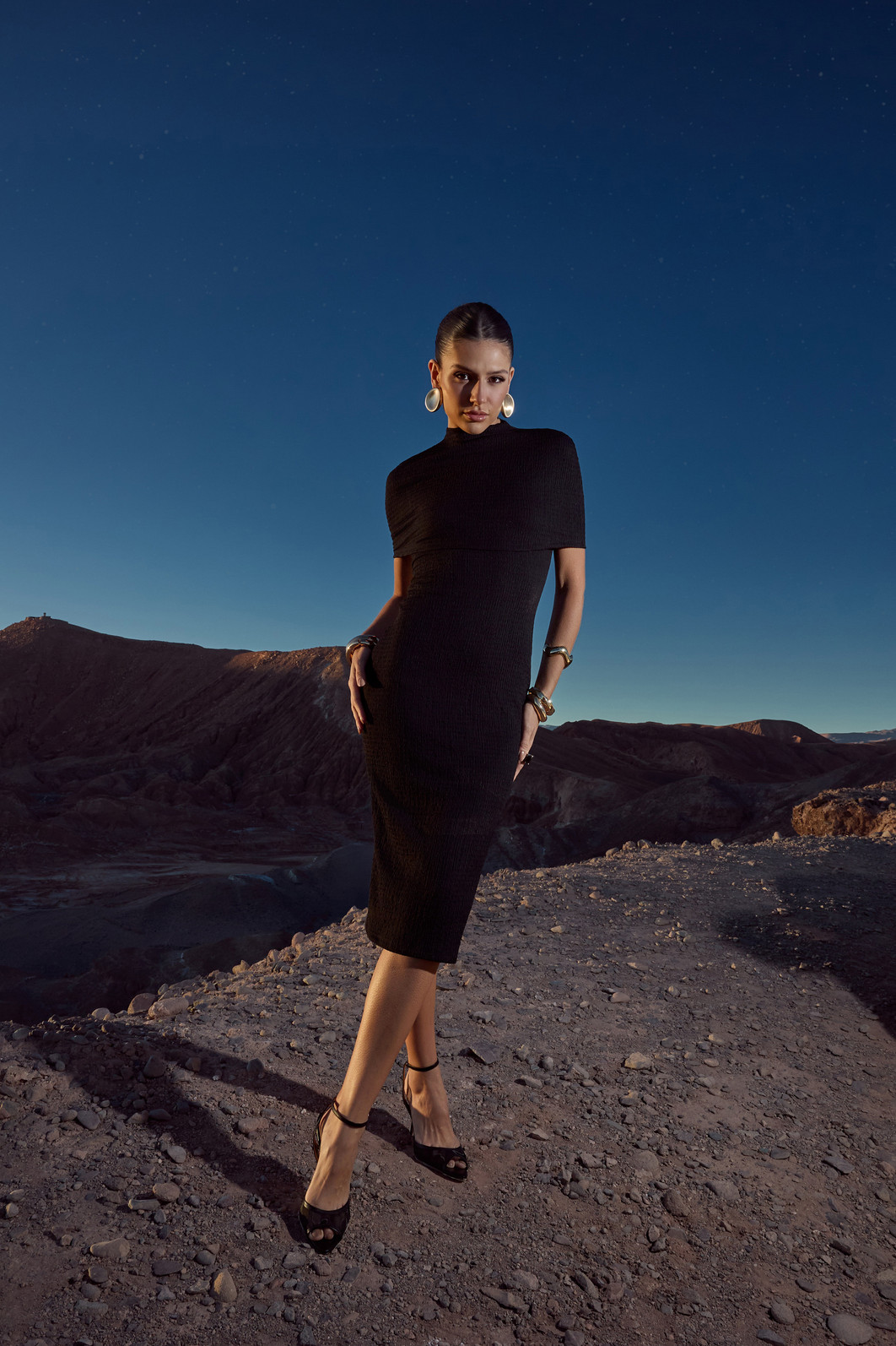 Vestido midi sem manga em malha texturizada com elastano. Possui decote mais profundo nas costas com elástico e corpo todo forrado. Detalhe de fenda lateral. Acompanha capa com gola inteira. A peça veste mais ajustada ao corpo. Composição vestido: 95% Poliéster, 05% Elastano. Composição forro: 90% Poliéster, 10% Elastano. MEDIDAS DA MODELO: *MODELO VESTINDO TAMANHO P/36 NA FOTO*.